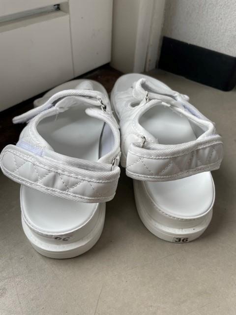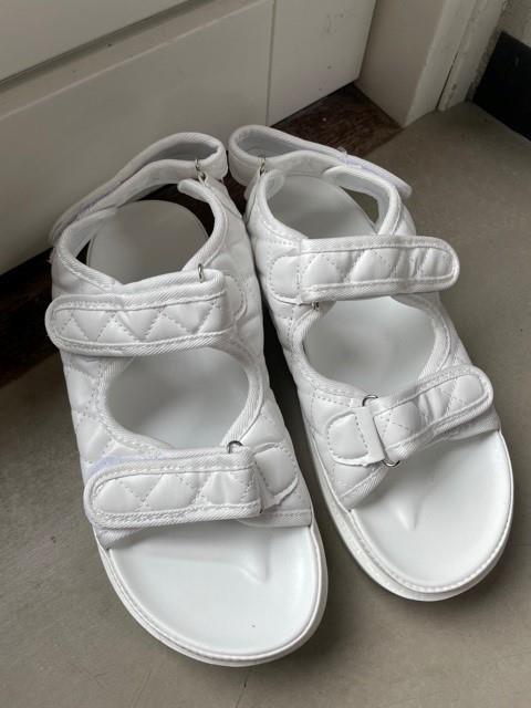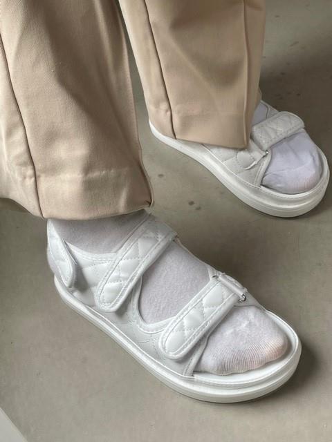 These sandals feature quilted, adjustable velcro straps and a flat rubber sole. These sandals come in black and in white.