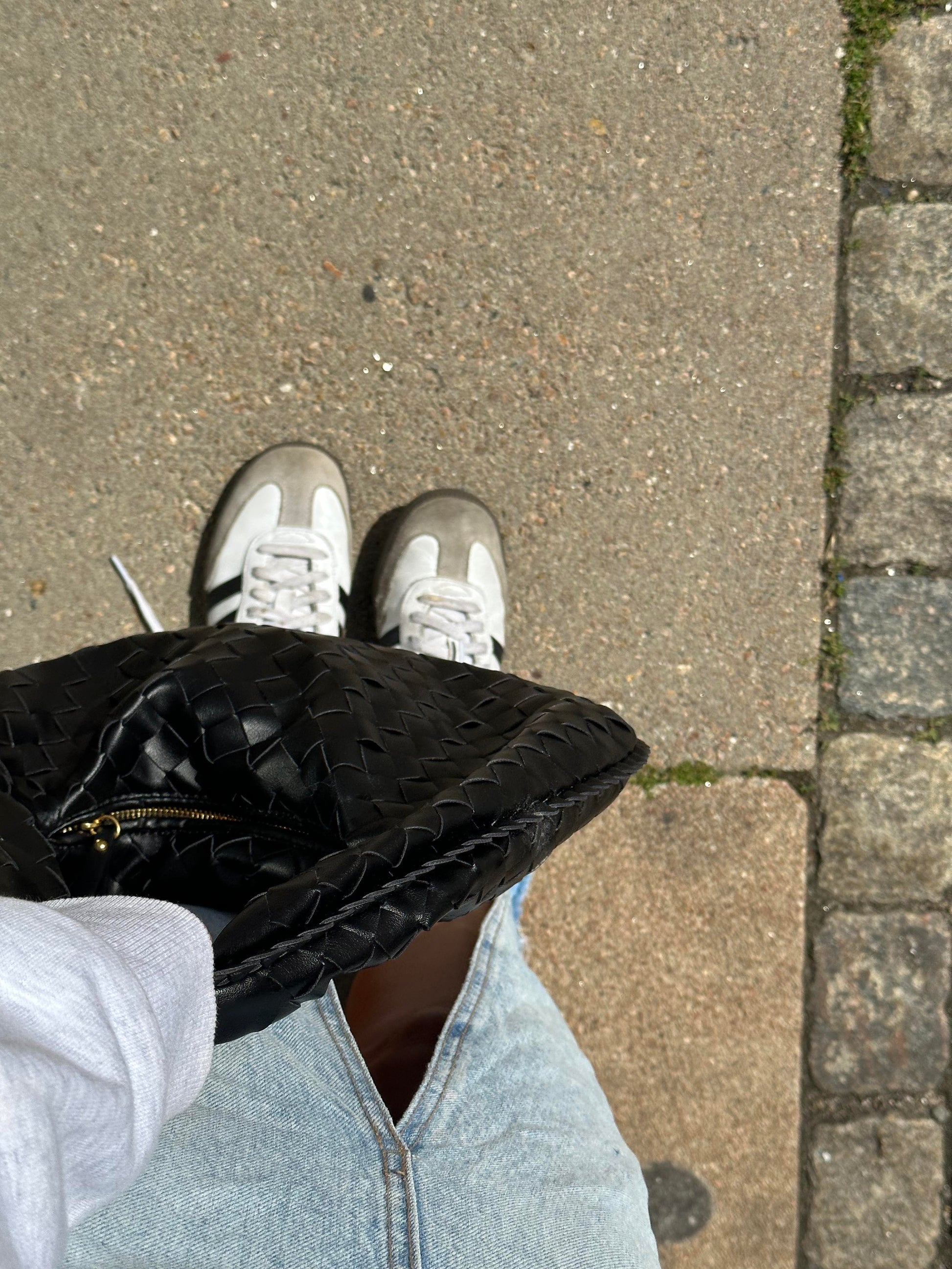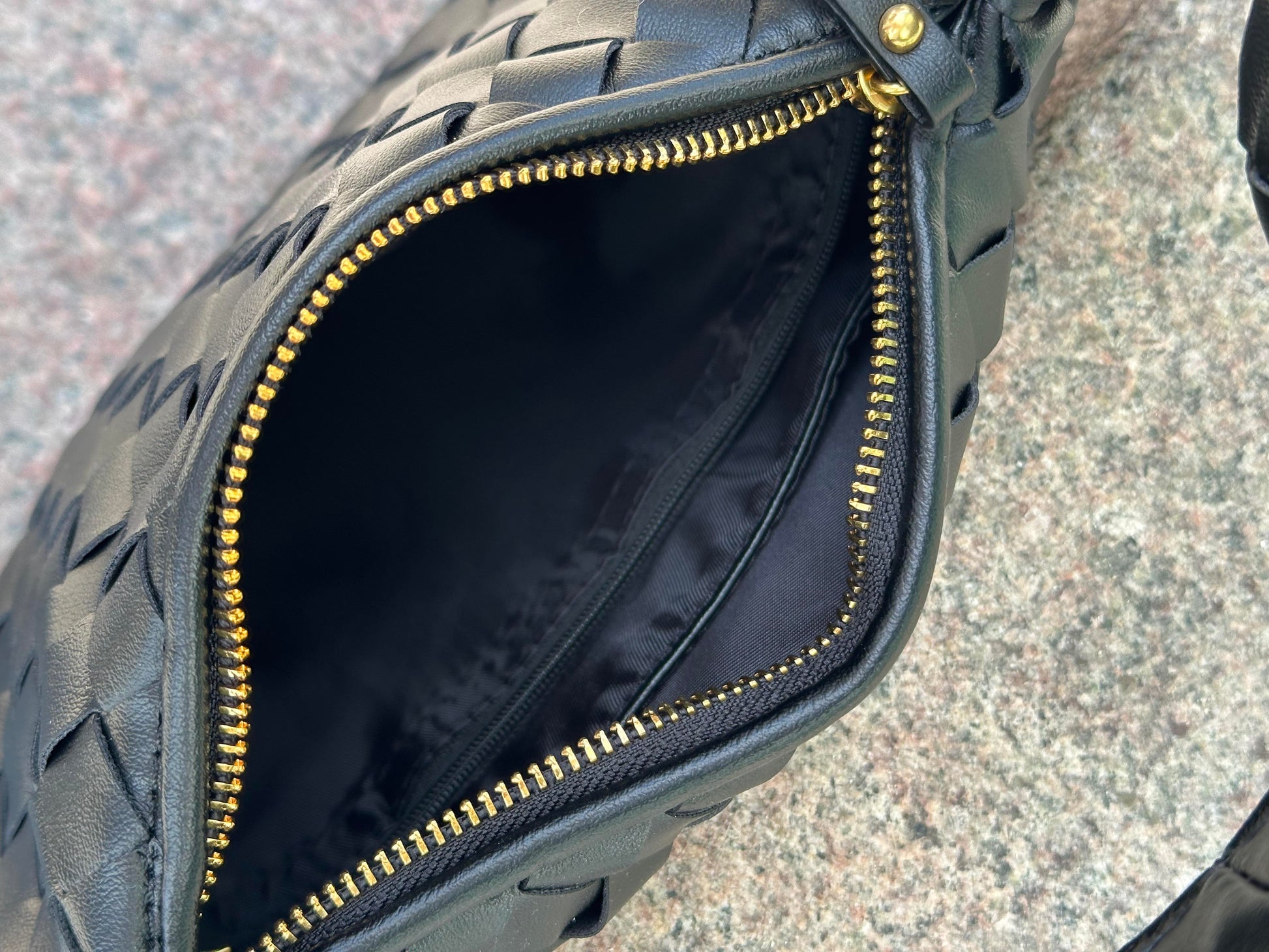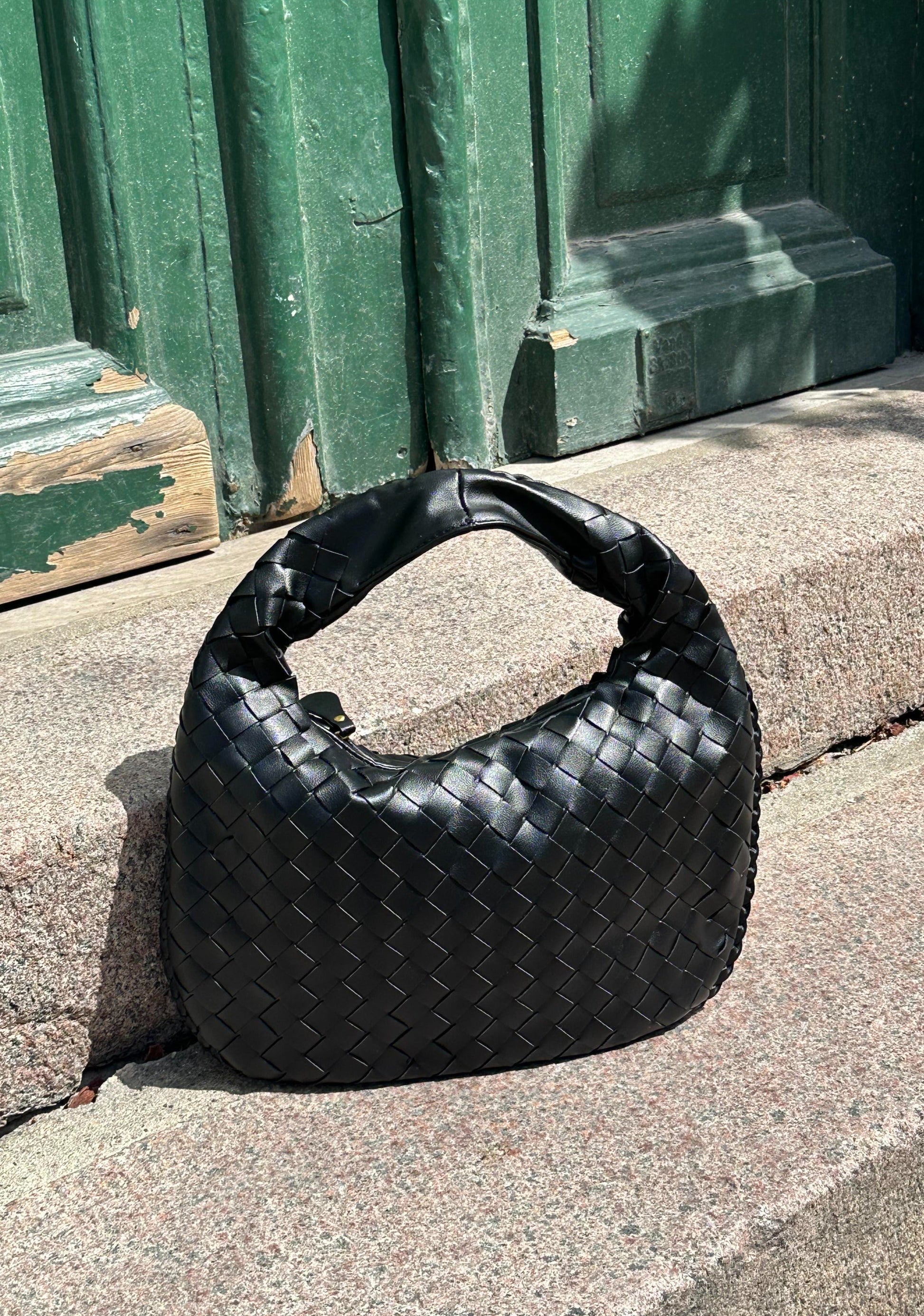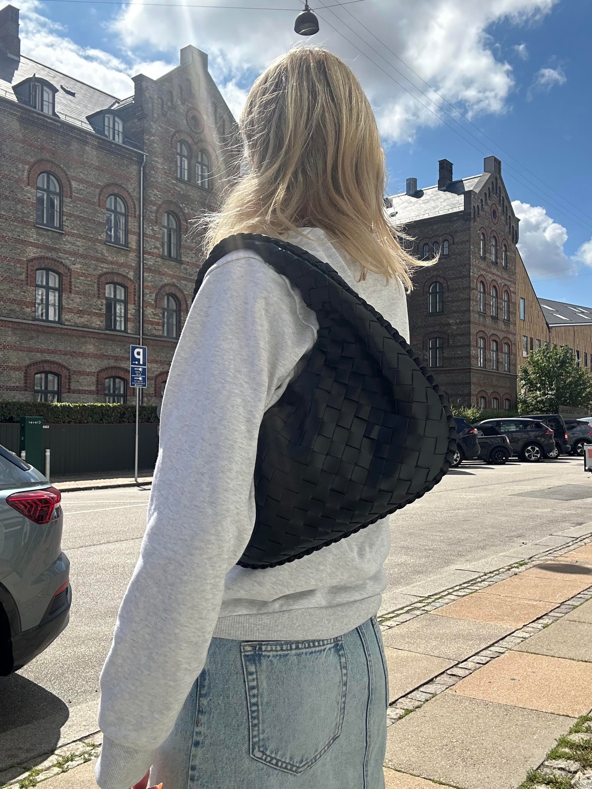 Our Paris shoulder bag has a round shape and a woven/braided design. The bag has a large main compartment with zip closure, and two smaller compartments with zip inside the bag and a small open pocket.