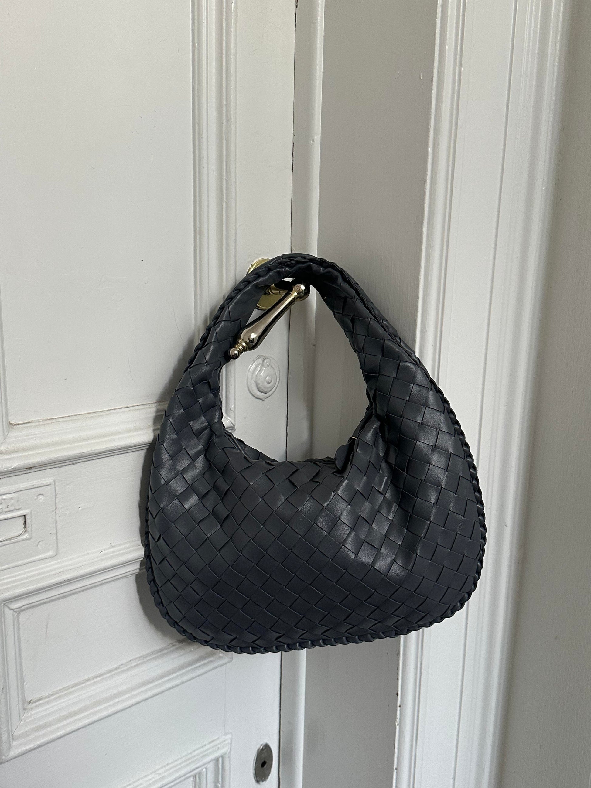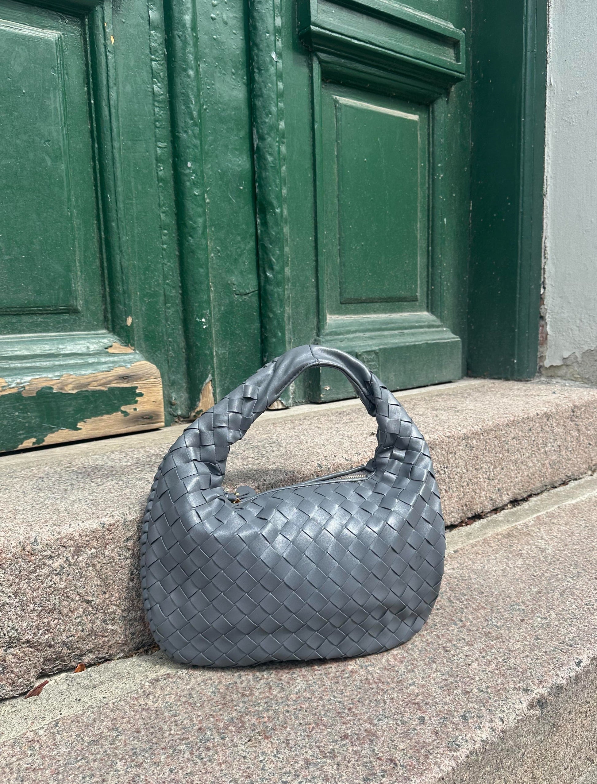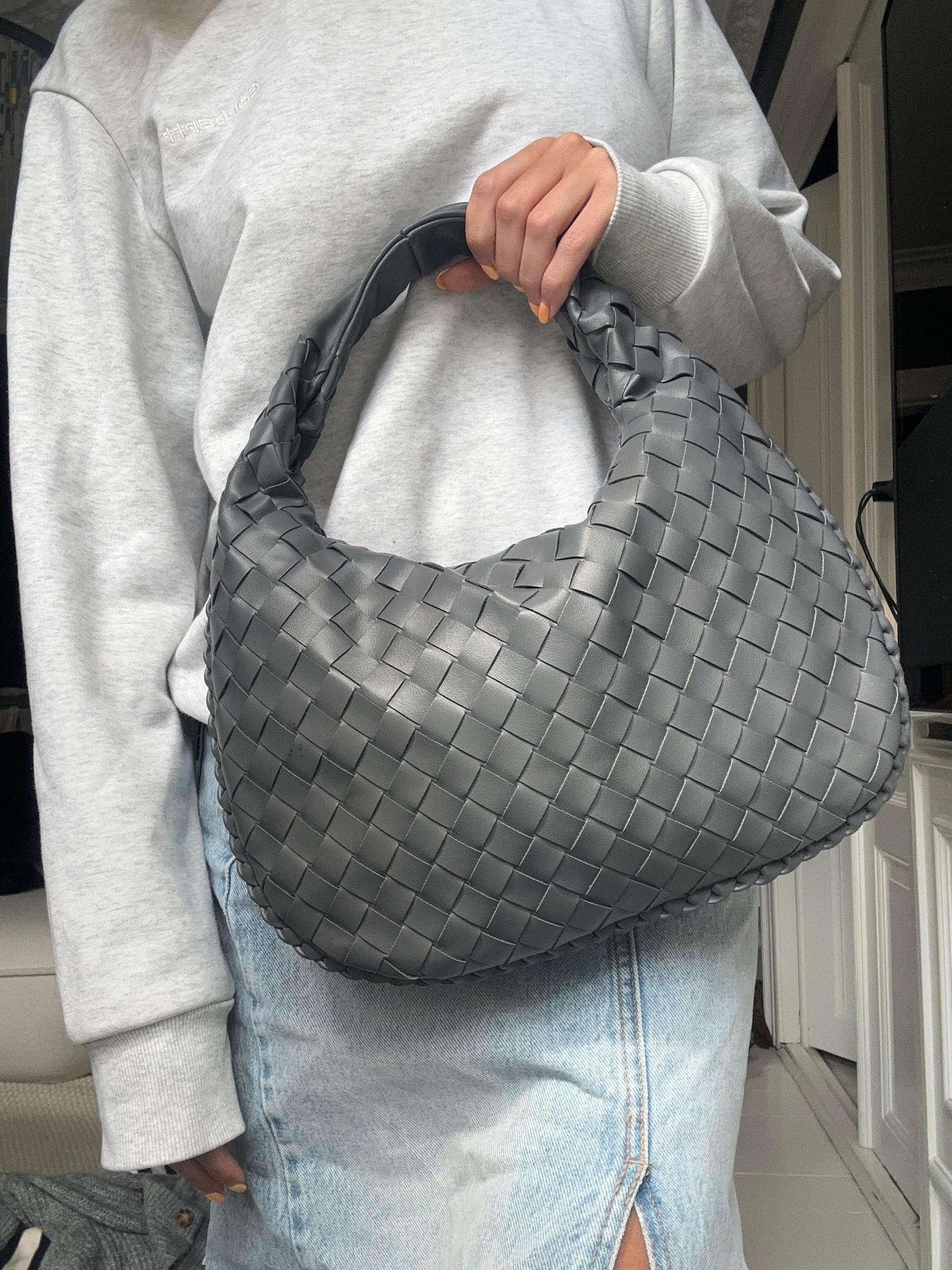 Our Paris shoulder bag has a round shape and a woven/braided design. The bag has a large main compartment with zip closure, and two smaller compartments with zip inside the bag and a small open pocket.Color: Grey