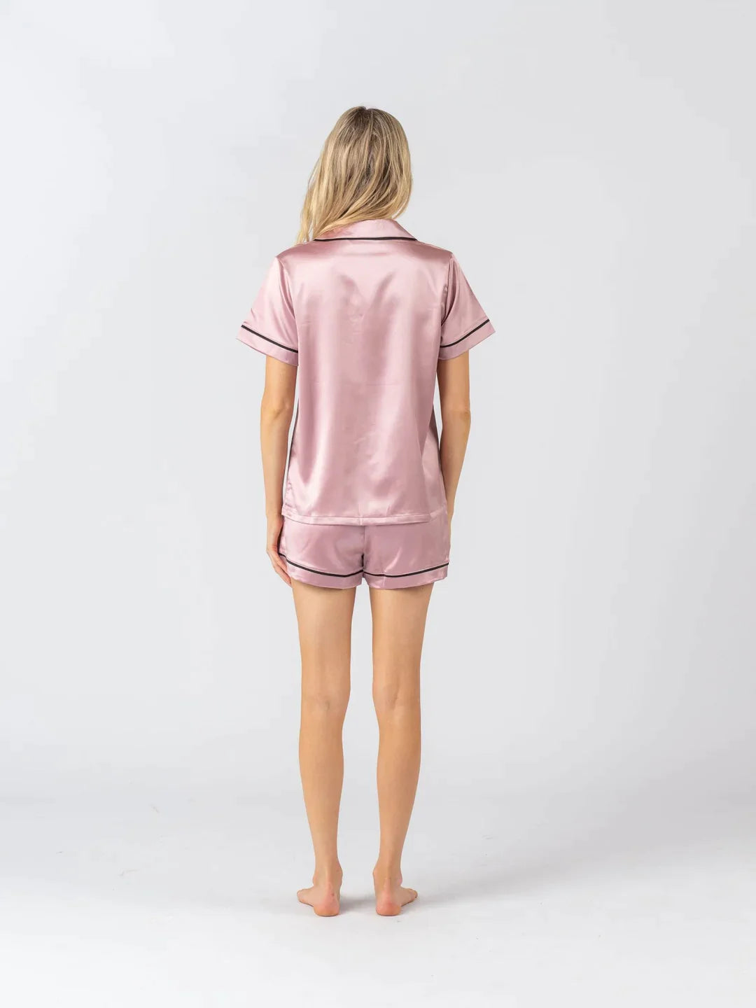 The soft Short Sleeve set features a collared button down full length shirt and ribbon-tied shorts with contrasting ebony piping detail.
