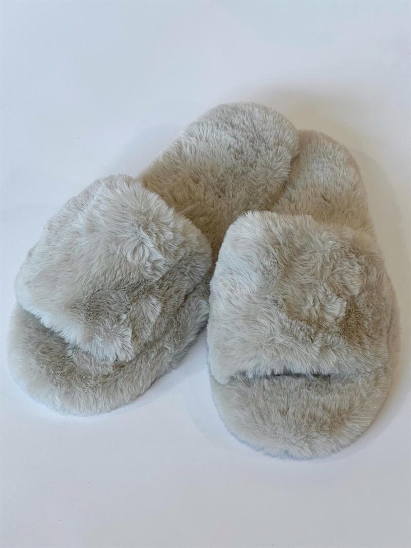 Soft fur sandal with rubber sole. Perfect for wearing inside in the cold months.