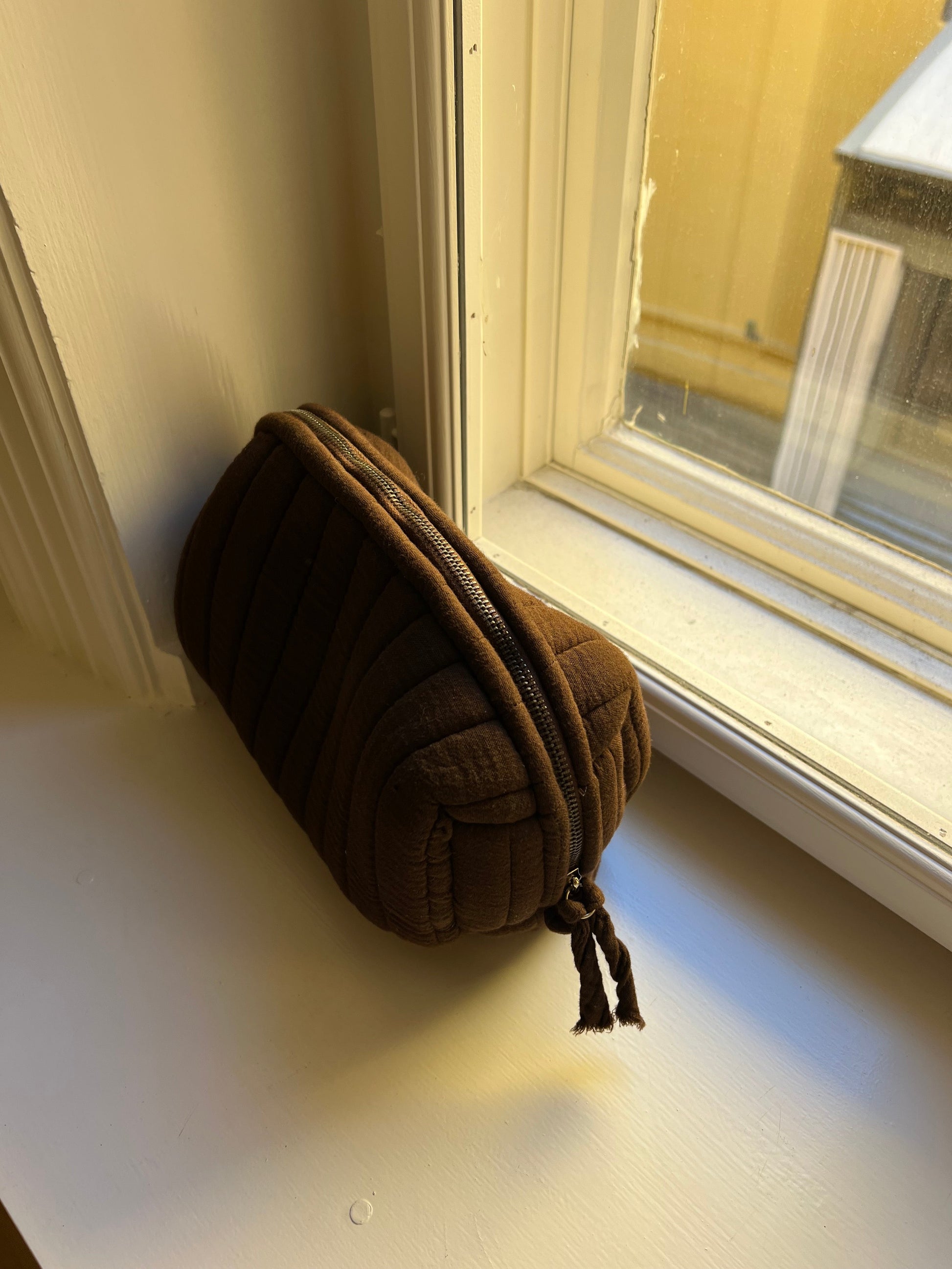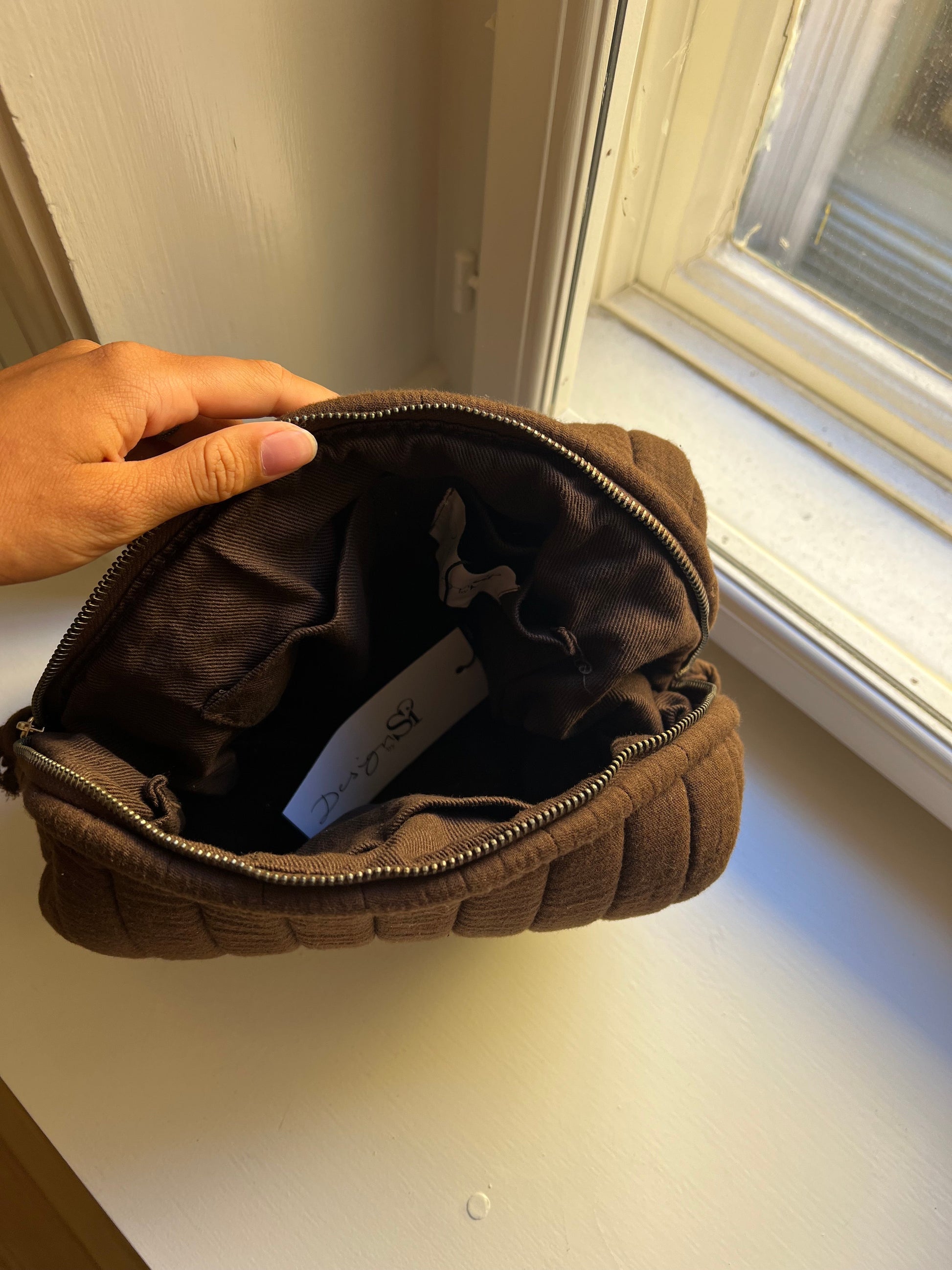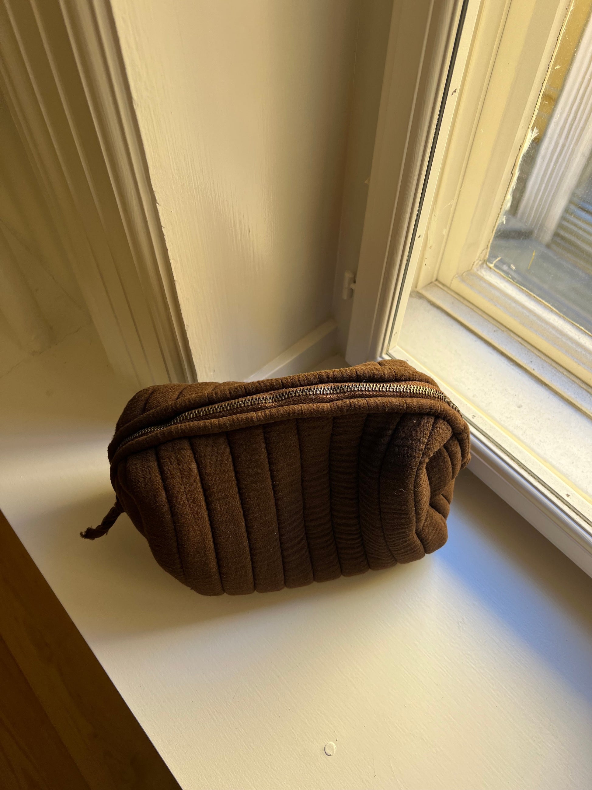 Cute toilet bag with stitching. The toilet bag opens with a zipper, has plenty of space, and has compartments inside.