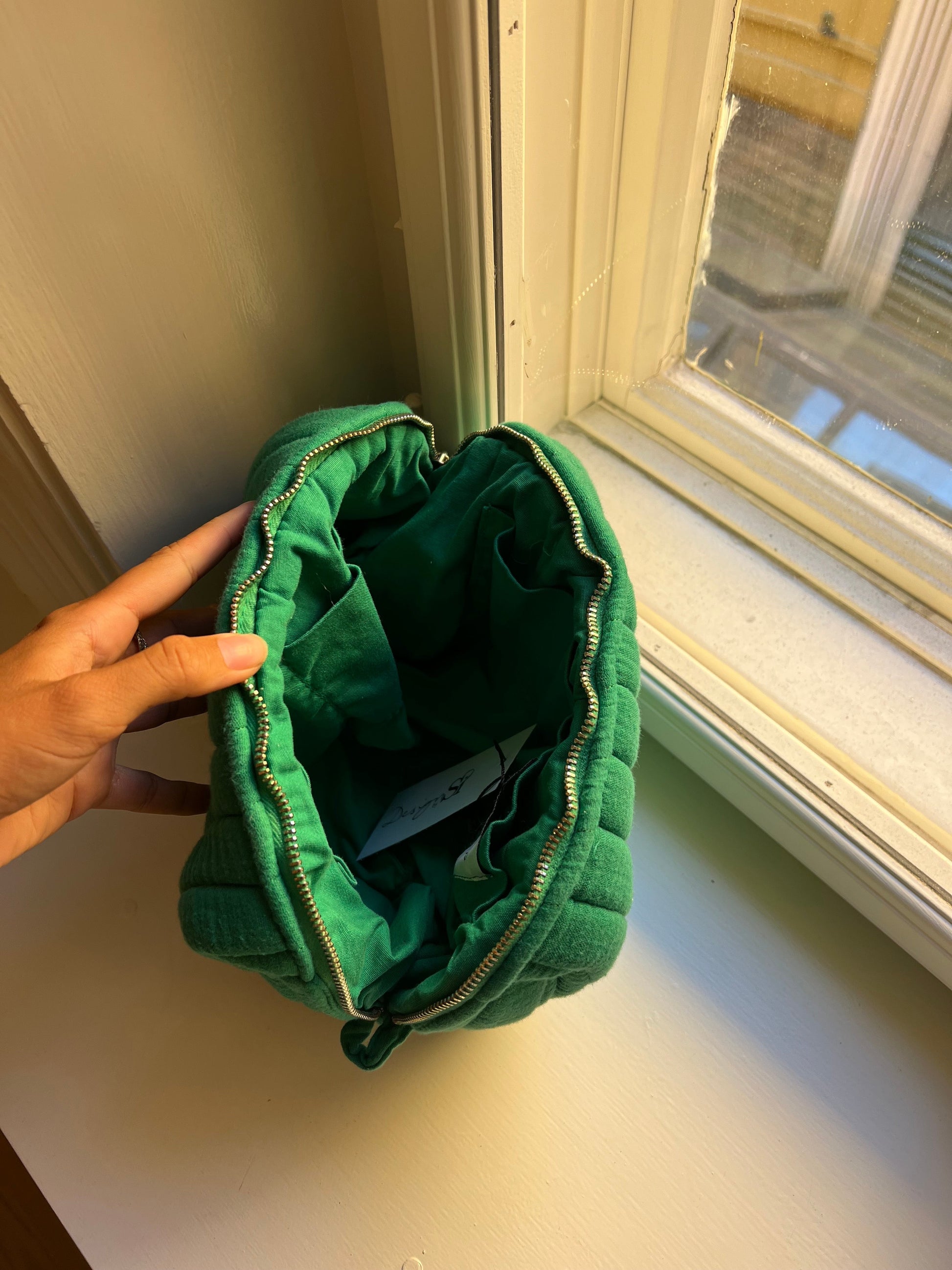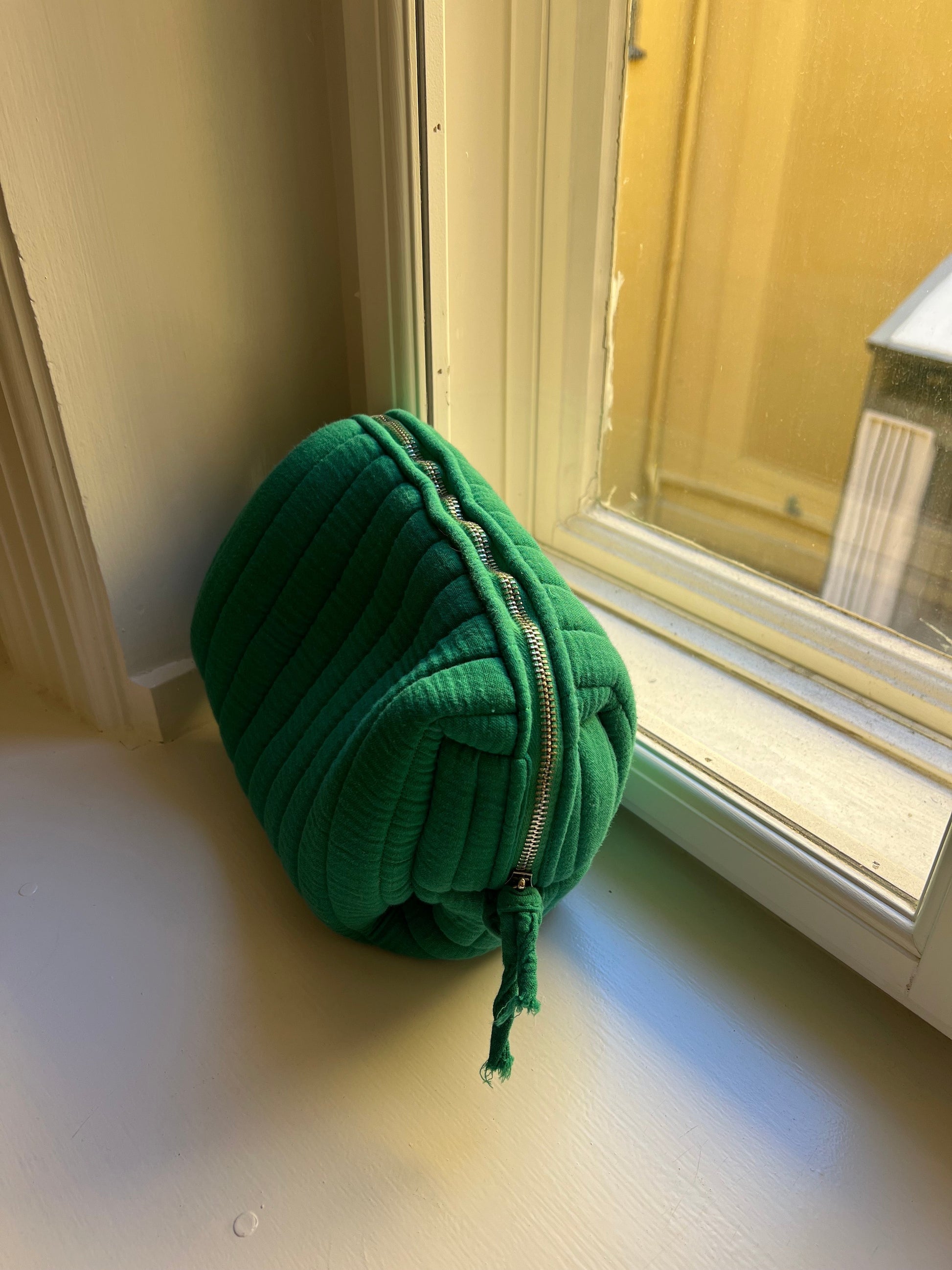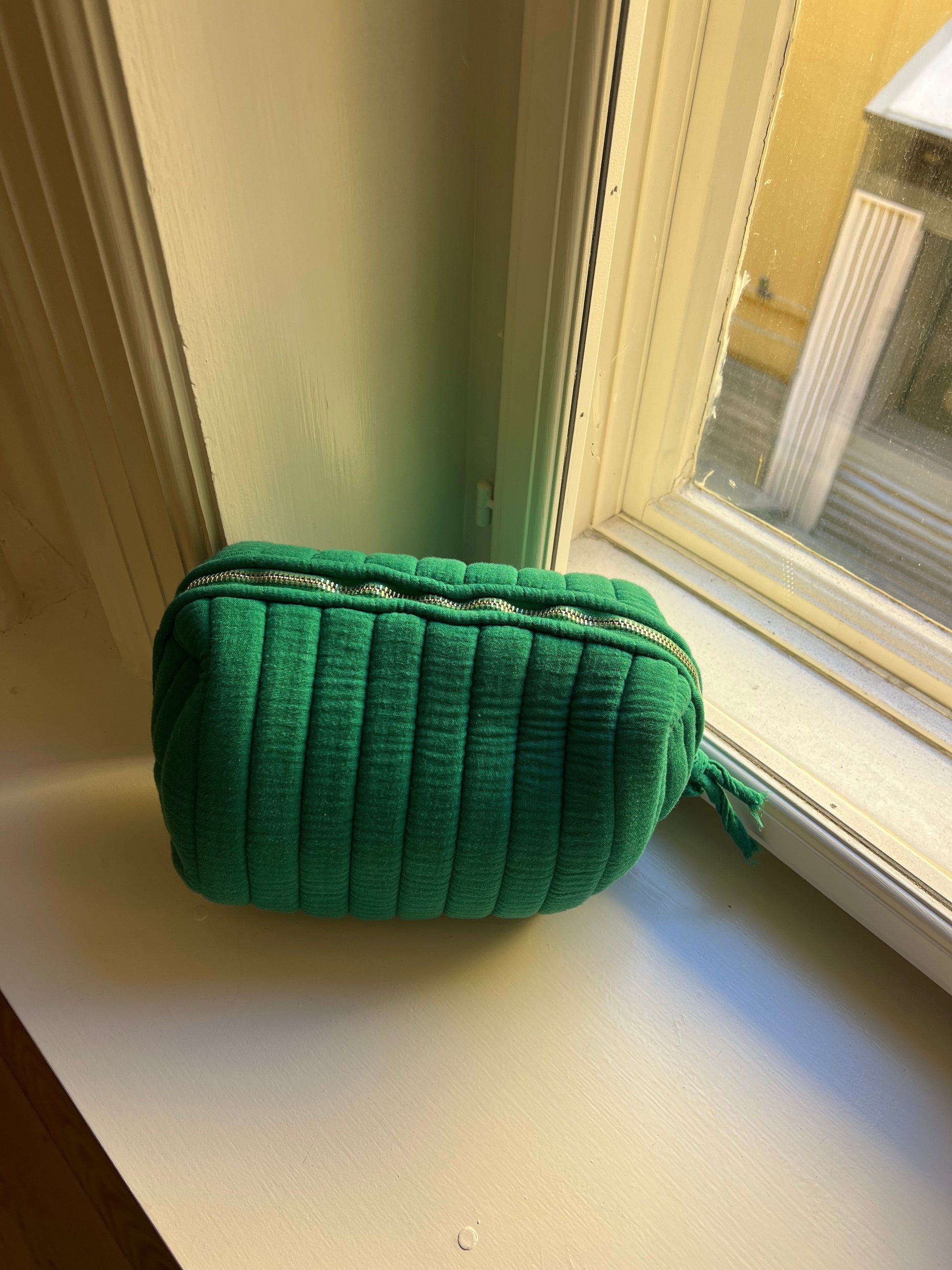 Cute toilet bag with stitching. The toilet bag opens with a zipper, has plenty of space, and has compartments inside.