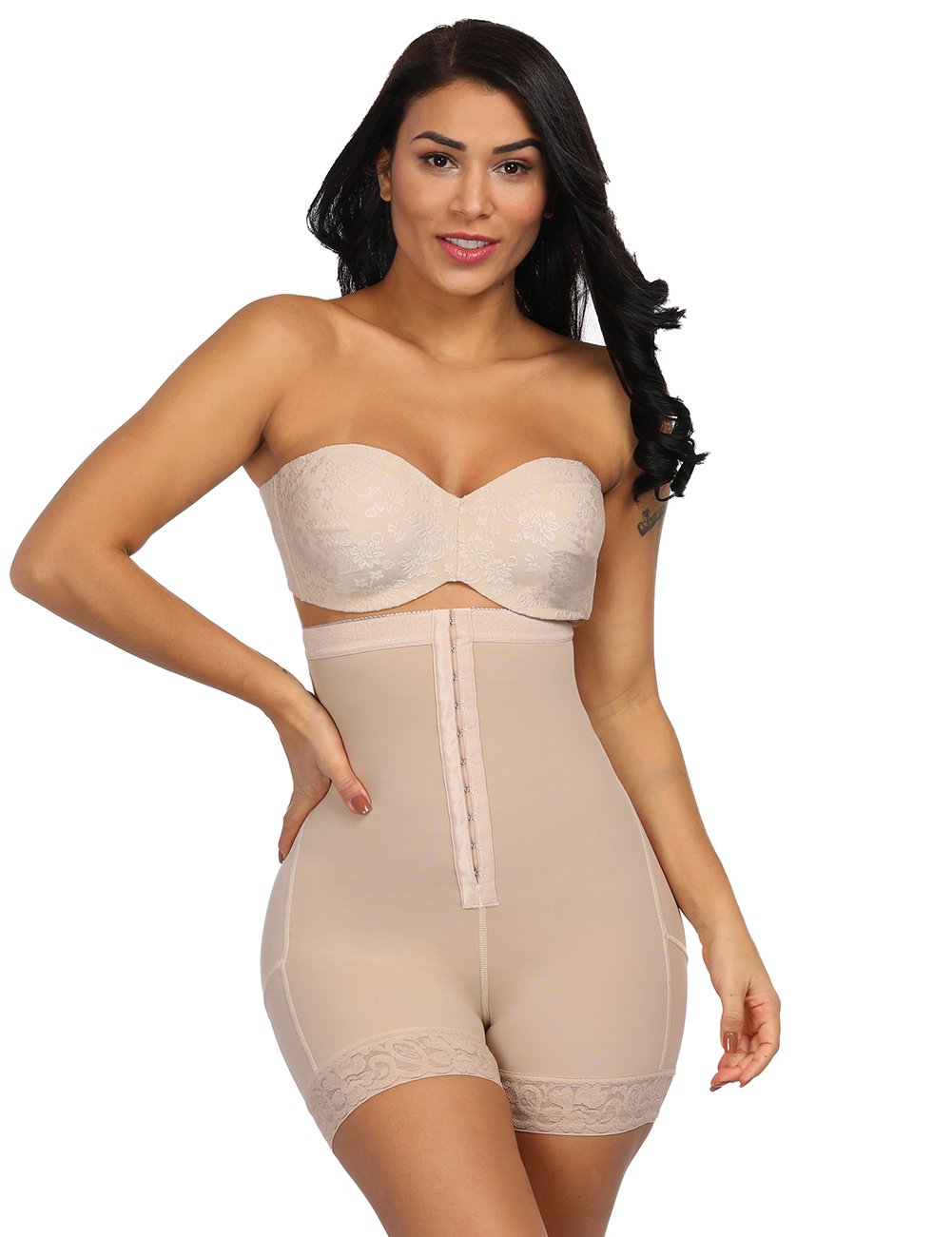 The hook-and-eye back closure ensures a secure fit with stronger compression